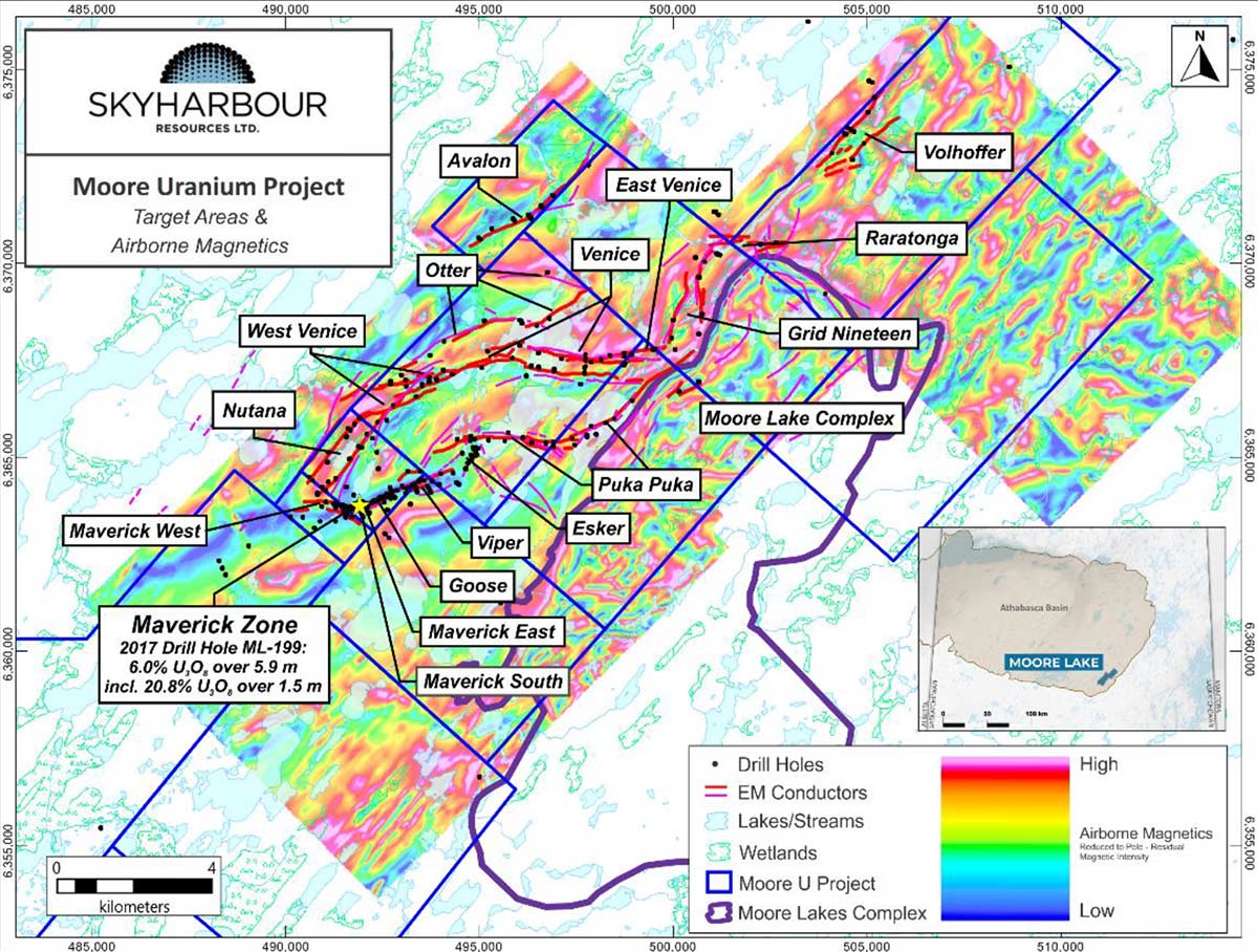 Furthermore, Skyharbour plans to test regional targets at Moore that have been further refined with modern geophysics and new geological modelling. This drilling will take place in conjunction with the multi-phased drilling campaign this year at the adjacent Russell Lake Project.