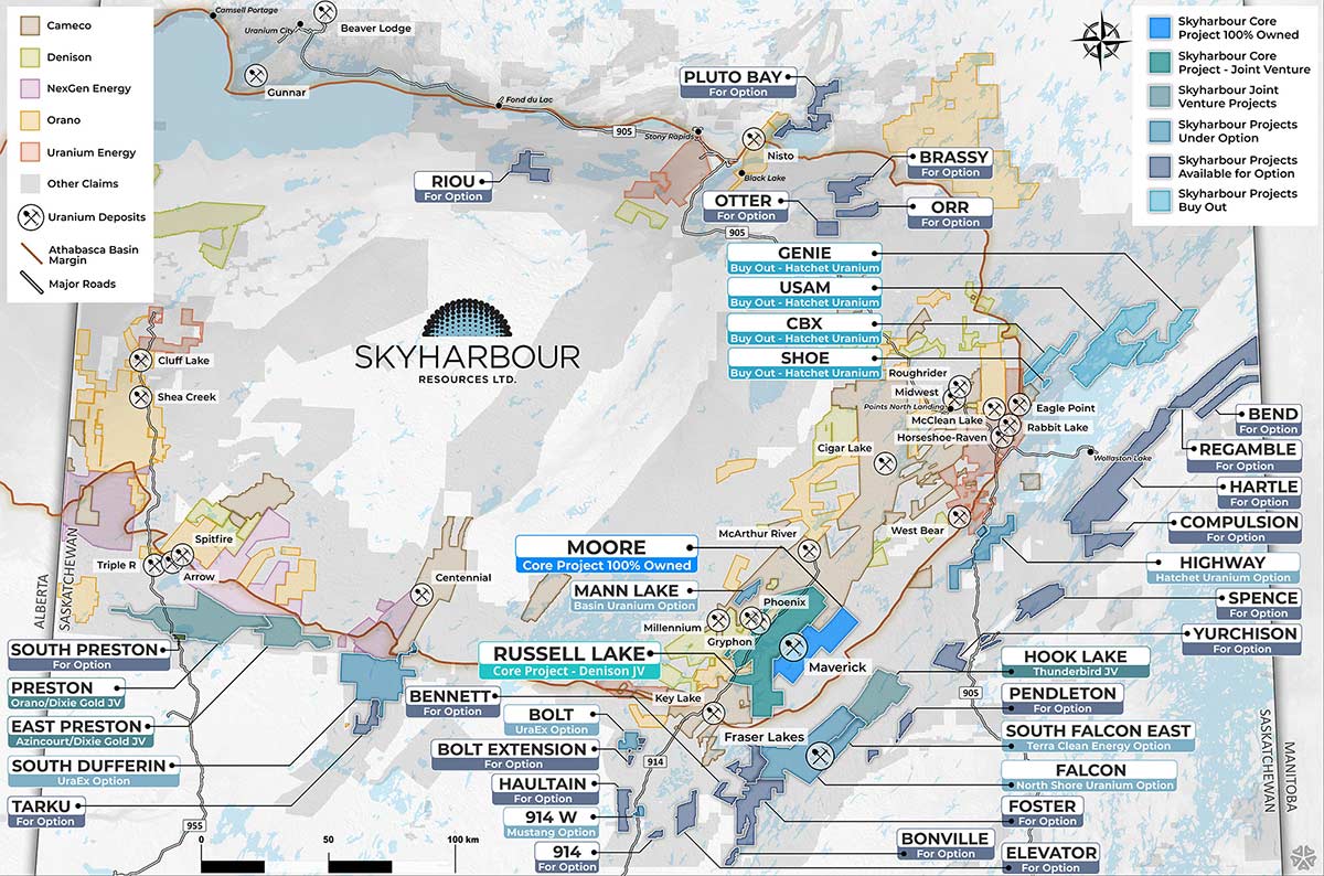 In addition to the co-flagship Moore Uranium Project and the JV partnership with Rio Tinto Exploration Canada on the other co-flagship Russell Lake project, Skyharbour presently has agreements in place with 10 partner companies who are actively advancing a total of fourteen uranium exploration projects in Saskatchewan’s Athabasca Basin region: