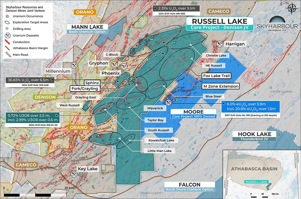To meet that growing demand, the Skyharbour team is presently focused on advancing its co-flagship Moore and Russell Lake uranium projects located in the southeastern portion of the Athabasca Basin in close proximity to Denison's Wheeler River uranium project and Cameco’s McArthur River uranium mine.